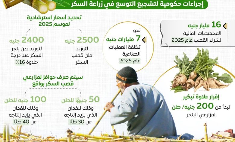 مصر تقترب من تحقيق الاكتفاء الذاتي من السكر بحلول 2026.. وتراجع الواردات بنسبة 54.5%نشر المركز الإعلامي لمجلس الوزراء تقريرًا جديدًا مدعومًا بالإنفوجرافات، أكد خلاله اقتراب مصر من تحقيق الاكتفاء الذاتي من السكر بحلول عام 2026، في إطار جهود الدولة لتعزيز الأمن الغذائي وتقليل الاعتماد على الاستيراد.وأوضح التقرير أن مصر تمكنت من تحقيق نسبة اكتفاء ذاتي بلغت 81% من السكر في مارس 2025، وسط توقعات بعدم الحاجة للاستيراد بدءًا من عام 2026، مشيرًا إلى أن أرصدة السكر التمويني الحالية تكفي لمدة 13 شهرًا.وكشف التقرير عن انخفاض واردات السكر الخام بنسبة 54.5% خلال الربع الأول من عام 2025، لتسجل نحو 111.1 مليون دولار، مقارنة بـ 244.4 مليون دولار خلال نفس الفترة من العام السابق.كما أبرز التقرير التوسع الكبير في زراعة المحاصيل السكرية، حيث ارتفعت مساحة الأراضي المزروعة ببنجر السكر بنسبة 25% لتصل إلى 750 ألف فدان خلال موسم 2024/2025، بإنتاج متوقع يبلغ 2.5 مليون طن، مقارنة بـ600 ألف فدان العام السابق.وأشار التقرير إلى أن الإنتاج الكلي من السكر وصل إلى 2.6 مليون طن في عام 2025 (لأول مرة في تاريخ مصر)، مع توقعات بارتفاعه إلى 2.9 مليون طن في 2026.وشهد قطاع التصنيع تطورًا لافتًا، حيث يضم السوق المصري 8 مصانع لإنتاج سكر البنجر، أبرزها “القناة للسكر”، أكبر مصنع بخط إنتاج واحد في العالم، بطاقة أولية 350 ألف طن سنويًا، والمستهدف رفعها إلى 750 ألف طن بحلول 2026.كما تم تطوير مصنع “الدلتا للسكر” برفع طاقته التشغيلية من 14 ألف إلى 21 ألف طن بنجر يوميًا، إلى جانب مصنع الشرقية بالصالحية الجديدة بطاقة 240 ألف طن سنويًا.وفيما يخص دعم زراعة القصب، خصصت الدولة 16 مليار جنيه لشراء المحصول في 2025، إلى جانب 7 مليارات جنيه موجهة للعمليات الصناعية. وتم تحديد سعر استرشادي لتوريد طن القصب بـ 2500 جنيه، وطن البنجر بـ 2400 جنيه (عند درجة حلاوة 16%).وتشمل خطط الدولة لإنشاء محطات لإنتاج شتلات القصب منها محطة “وادي الصعايدة” بطاقة 160 مليون شتلة، و”كوم أمبو” بطاقة 30 مليون شتلة، للمساهمة في زيادة الإنتاجية.كما تم اعتماد حوافز تشجيعية للمزارعين، منها علاوة تبكير تبدأ من 200 جنيه للطن لمزارعي البنجر، وحوافز إضافية لمزارعي القصب تصل إلى 100 جنيه للطن لمن تتجاوز إنتاجية فدانهم 40 طنًا.وتؤكد هذه الجهود حرص الدولة على تأمين احتياجات المواطنين من السلع الاستراتيجية، ودعم الاقتصاد الوطني عبر خفض الفاتورة الاستيرادية، وتحقيق الاستدامة في قطاع الزراعة والصناعات